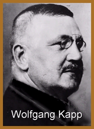 - March 13th - 17th - Right-wing politician Wolfgang Kapp attempts to overthrow the Republic. With support from General Lüttwitz's Reichswehr and disgruntled Freikorps troops he forces Ebert's government to flee Berlin. However, after arriving in the capital, most Reichswehr and Freikorps troops remain neutral to both sides without violence as an enticement. Ebert calls for a general strike in Berlin which succeeds in neutralizing Kapp's putsch after 4 days. Kapp and Lüttwitz flee to Sweden.